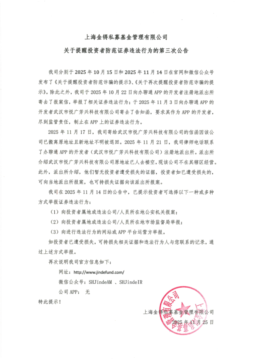 关于提醒投资者防范证券违法行为的第三次公告(2025/11/25)